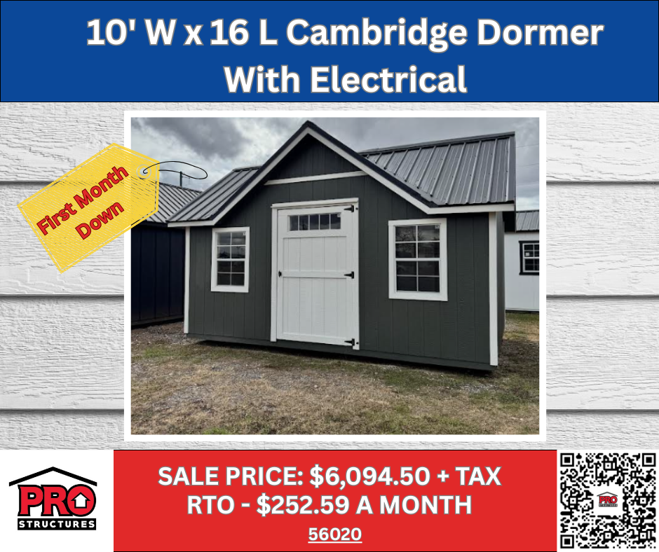 Upgrade your property with this 10×16 Cambridge Dormer Shed with Electrical — a stylish, move-in-ready portable building perfect for a backyard office, studio, workshop, or organized storage space. Built for Texas weather and designed for long-term durability.