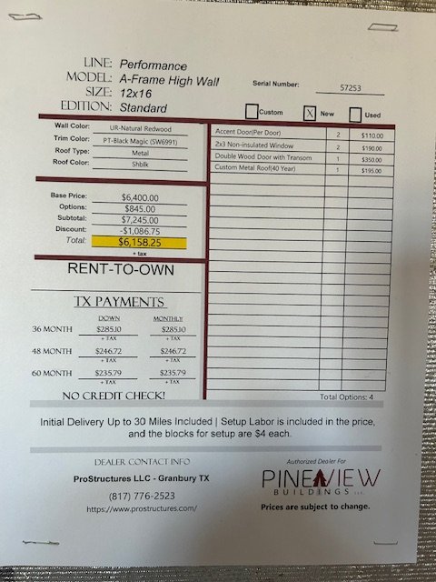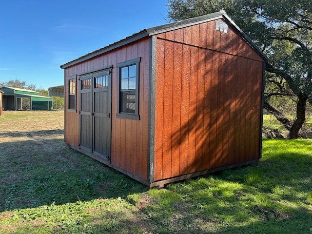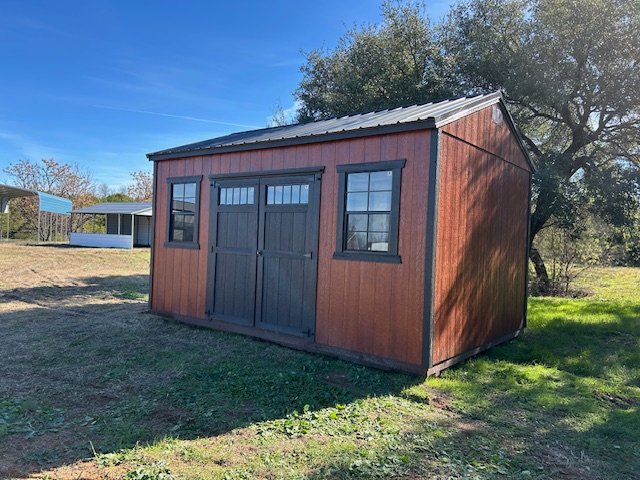 - Color Details: Wall Color: Natural Redwood Stain Trim Color: Black Roof Color: Black